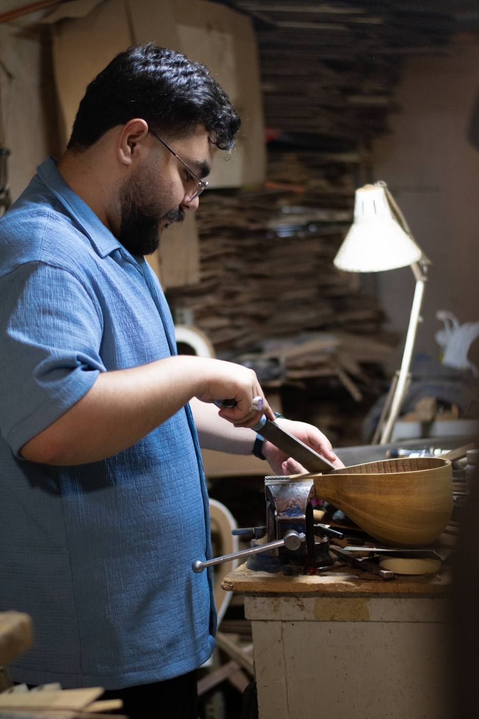 Mohammad Mostafa Heydarian's father was a percussion player who started learning tanbur crafting at the age of twenty. It is in these overlapping worlds of tradition, family, faith, and culture that Mostafa is born. There are pictures of him holding a tanbur before he can even walk and he began learning scales at around seven years old. Also around this time the family moved to Karaj, a move that provided more opportunities to meet musicians that regularly drop by Morteza's tanbur studio. It is there that Mostafa starts taking lessons from master teachers.